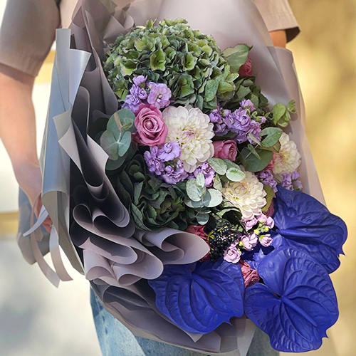 Букет "Сальма" из Голландской гортензии, антуриума, ягод вибирнума, брассики, ароматной маттиолы и георгин