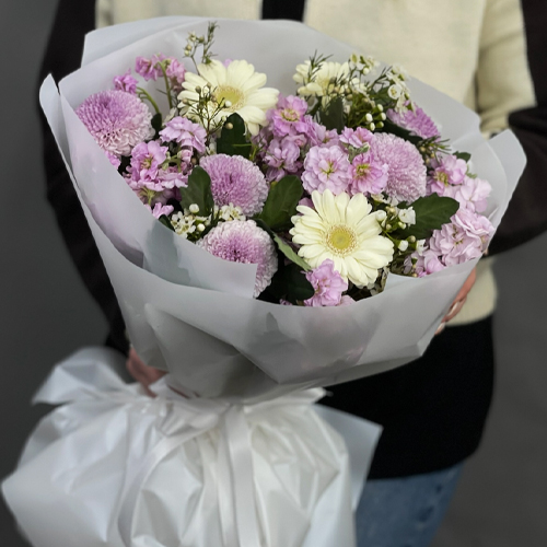 Букет "Мечты сбываются" из хризантем Момоко, ароматных маттиол, хамелациума и гербер